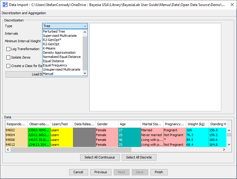 - Selecting a Discretization algorithm applies variable by variable, i.e., you can use a different algorithm for each Continuous variable.