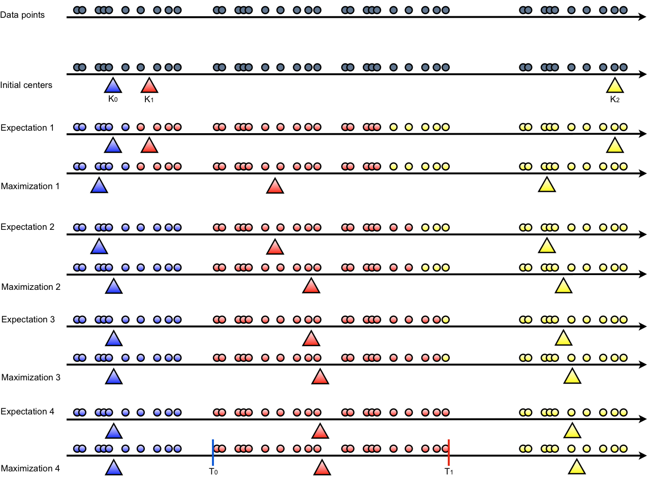 - Maximization: each center position is computed as the barycenter of its associated points