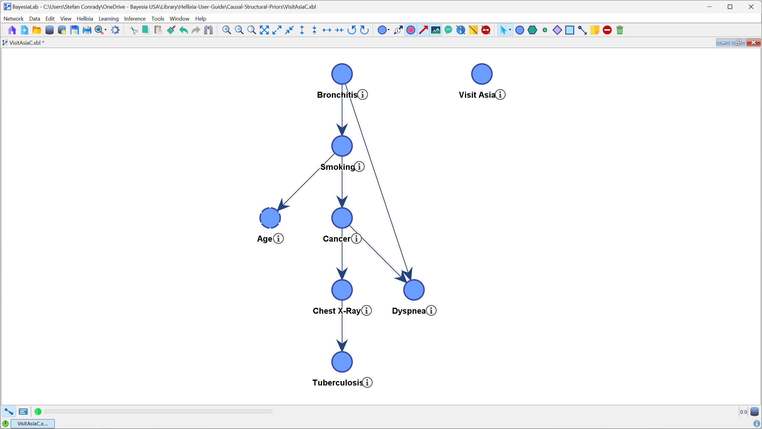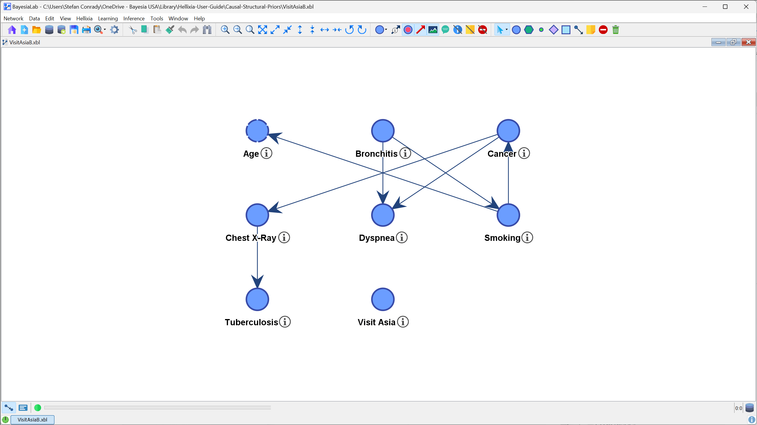 - This newly-learned Bayesian network features directed arcs, but they can clearly not be interpreted as causal, e.g., Smoking could not possibly be a cause of Age.