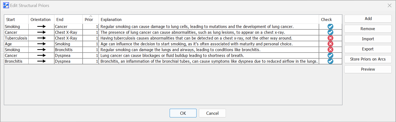 - In the Causal Structural Priors window, you need to specify a number of items: