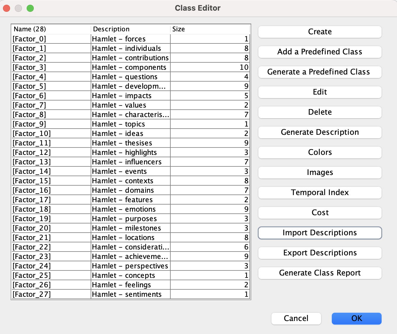 - Open the Class Editor and run Class Description Generator to generate descriptive names for the factors in question. Use the Export Descriptions function, and save the newly created descriptions.