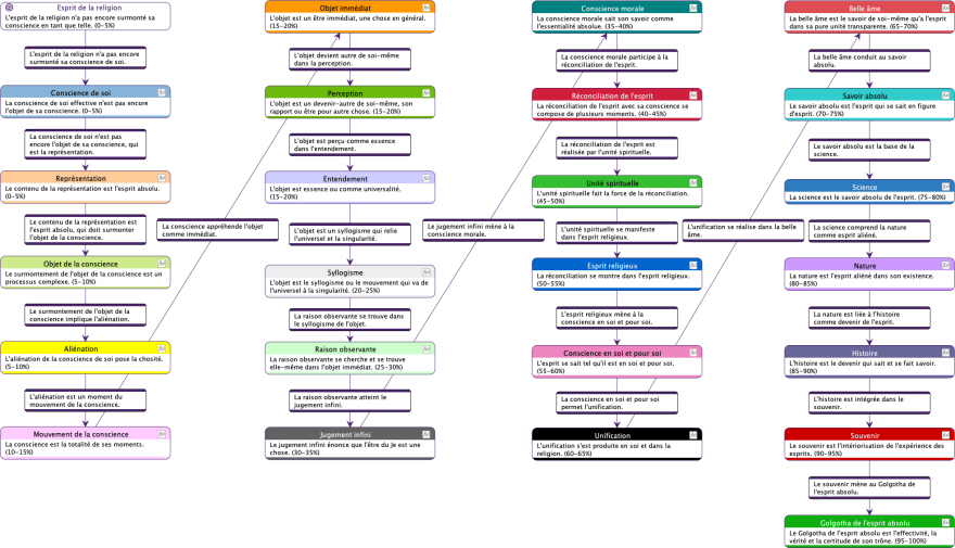 Ce diagramme décrit un processus de développement progressif de la conscience humaine. Chaque étape représente une forme plus sophistiquée de prise de conscience et de compréhension, avec l’aboutissement ultime du savoir absolu, une connaissance totale intégrée du monde et de soi-même. Ce modèle vise à expliciter comment les individus parviennent à une connaissance de plus en plus approfondie de la réalité et de leur propre nature. Hegel conçoit ce cheminement comme une ascension vers l’Esprit absolu, où la conscience atteint sa pleine réalisation.
