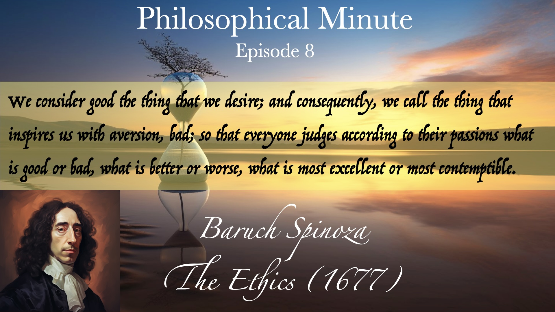 Welcome to the eighth installment of the Philosophical Minute, where we continue our exploration of the works of Baruch Spinoza. Today’s focus is a captivating foray into Spinoza’s reflections on desire, and its profound influence on our perceptions of good and evil: